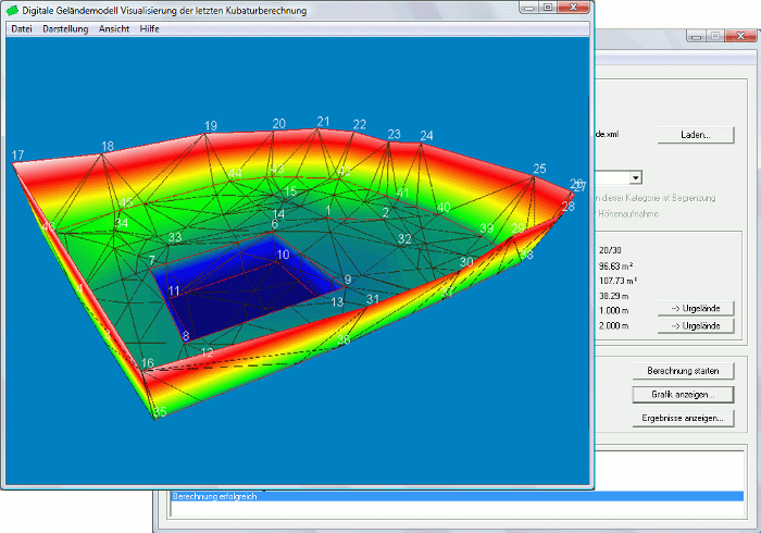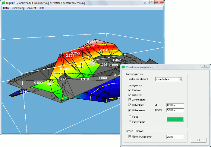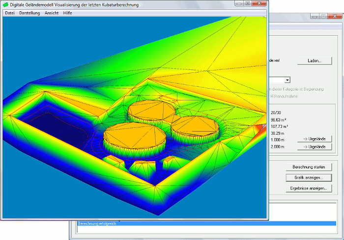 The surfaces can be specified either by measurements, by CAD data or by horizontal levels of a fixed height. If required, the elevation of a horizon can be shifted. The automatic triangular meshing takes breaklines into account, and also allows defining boundaries or cutouts in the billing area.